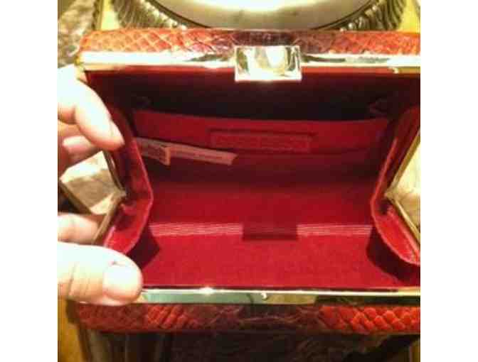 Two tone red faux Snakeprint closed by a snap gold clasp. Interior opens wide with two stretch panels on either side, plus interior side pocket.