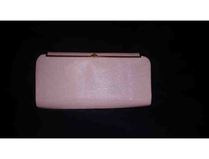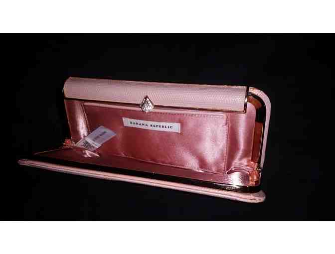 Banana Republic-Pink scaly embossed pebbled clutch purse. Gold color trim with rhinestone diamond shaped clasp closure at top.