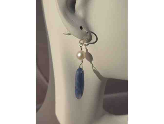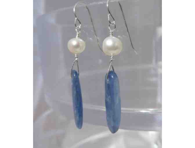 Skinny Kyanite accompanied with natural freshwater pearls. Dainty cute earrings! Sterling Silver is used throughout.