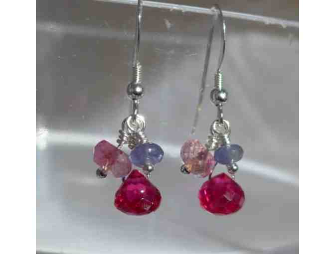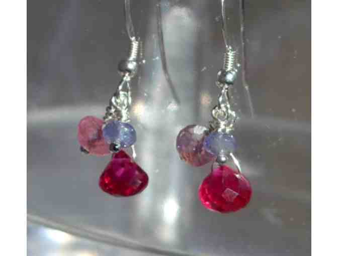 Beautiful hot pink rubelite color corundum accompanied with genuine lavender tanzanite and rare pink moonstone. Pink corumdum is appoximately 5 ~ 7 mm. Moonstone is about 5 mm and tanzanite is about 3 ~ 4 mm. Sterling silver is used throughout.