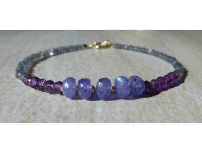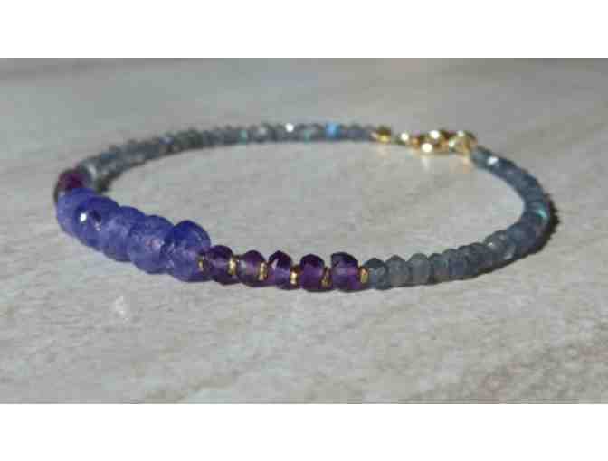 Made with amazingly beautiful purple moonstone, amethyst, and bluish labradorite. Three different colors of blue and purple blends very well together! Karen Hill 24K gold vermeil is used between beads as spacer and all the findings are gold filled. This is a dainty bracelet. The center lavender purple moonstone measures about 5 ~ 5.5 mm in width. Amethyst measures about 3.5 mm in width, and labradorite measures about 3 mm.