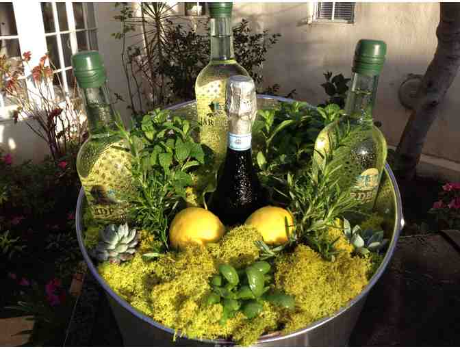 3 bottles of JARDESCA California Aperitiva, 1 bottle of prosecco, 2 stemless wine glasses, fresh fruit and herbs