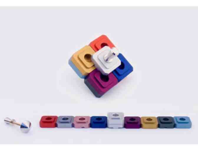 DREIDEL DESIGN TRAVELING MENORAH. Here, style meets tradition! The Dreidel set combines the nine of candleholders of the menorah with a dreidel to form a contemporary gift-set for anyone to celebrate Hanukkah. The modular design is ingenious and highly original. Made of lightweight anodized aluminum, the set folds away for safe keeping; and comes with a velvet pouch size - 7.5 X 30 cm |