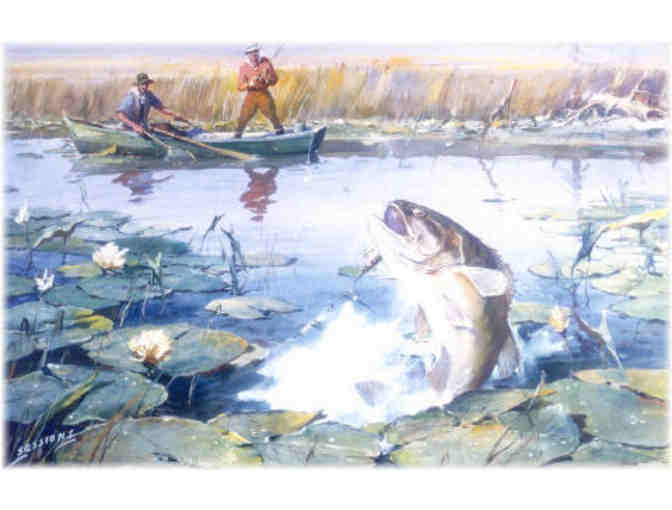 James M. Sessions, noted for his World War II series also turned his talented vision to wildlife. In this poster he has captured the excitement of fishing and the grandeur of the bass. A great addition to a fisherman's collectiion.