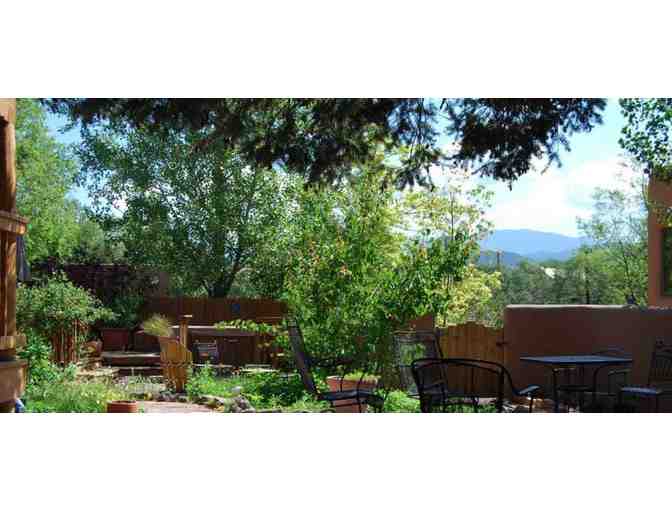 Casa Cuma Bed & Breakfast located in Santa Fe, New Mexico is an easy five minutes walk to the restaurants and a ten minutes walk to the Historic Plaza, the center of Santa Fe culture. We offer four luxurious rooms at the main B&B, all with private entrances and portals (porches) for your use, as well as two casitas (little houses) and a full house on a ridge. A full Breakfast with a hot entree is served at the main B&B with mountain views under the giant fir tree in the summer and by a crackling fire in the cooler months. Free parking and a steaming outdoor hot tub are available for your use as well.
