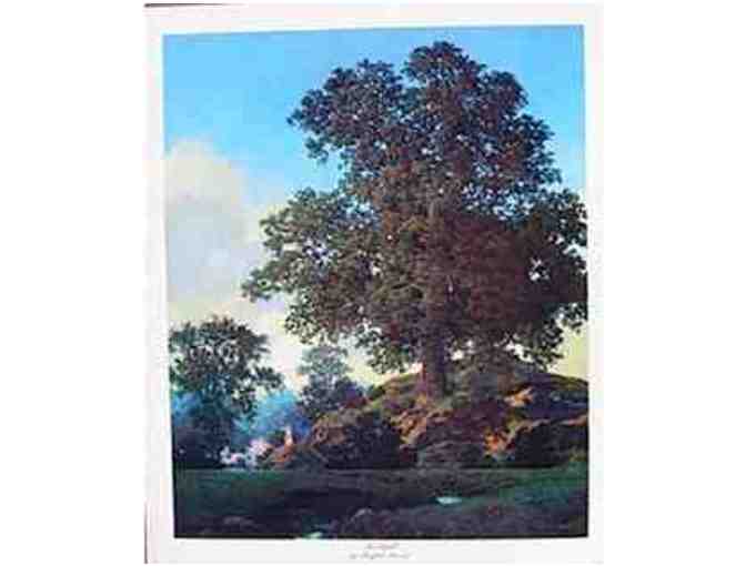This print American painter and illustrator Maxfield Parrish was active in the first half of the twentieth century, known for his distinctive saturated hues and idealized neo-classical imagery. Parrish's art features dazzlingly luminous colors; the color Parrish blue was named in acknowledgement. He would build up the depth in his paintings by photographing, enlarging, projecting and tracing half- or full-size objects or figures. Parrish then cut out and placed the images on his canvas, covering them with thick, but clear, layers of glaze. The result is realism of elegiac vivacity. His work achieves a unique three-dimensional appearance.
