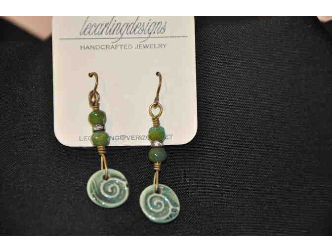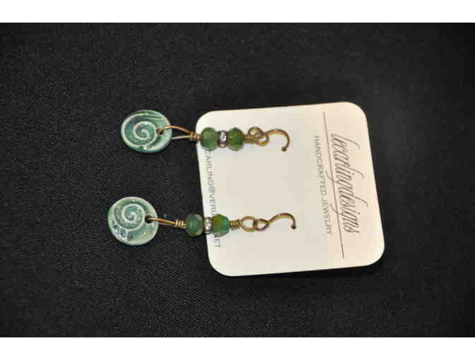 This listing is for a pair of Teal Ceramic Handcrafted earrings that are in a spiral pattern on a gold wire wrapped post with a green stone. These will pop any outfit.