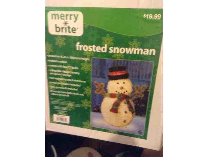 Up for auction is a 26 inch Indoor/Outdoor Lighted Frosted Snowman, new in box. Rust-resistant coated wire frame and collapsible design for easy set-up and storage. Pick up from CRP-730.