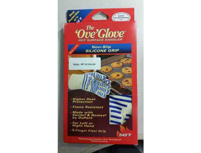 Comfortable. Five-fingered flexi-grip. For left or right hand. Withstands extreme heat up to 540 degrees F. The Ove Glove is perfect for the kitchen, barbeque and handling hot surfaces around the house. The Ove Glove exterior layer is made of DuPont Nomex and Kevlar. Interior layer of soft doubleknit cotton. Machine washable. The thermal properties of The Ove Glove outer layer, which is made of Nomex and Kevlar dramatically extend the time you can handle a hot object in your hands. The tough exterior of this glove forms a thermal isolation barrier, slowing the temperature increase in the interior layer of soft doubleknit cotton. When exposed to an open flame, the outer layer of glove does not catch fire and does not melt. The Ove Glove's outer layer is made of 86% Nomex and 14% Kevlar. Classified UL: Protective kitchen apparel as to heat and flame resistant only. Maximum surface temperature 540 degrees F.