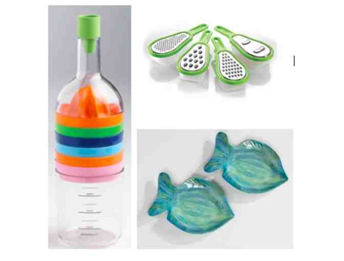 8-in-1 Kitchen Tool - Convenient bottle hides a kitchen’s worth of cooking accessories that will make food prep, clean up and storage more efficient. 11”H x 3”D. BPA Free plastic. Top rack dishwasher safe.