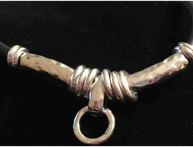 - Silver Tone "Circle" Charm with Hammered Silver Toned Cylinders & Silver Toned Circular Beads on a Black Waxed 17" Cord