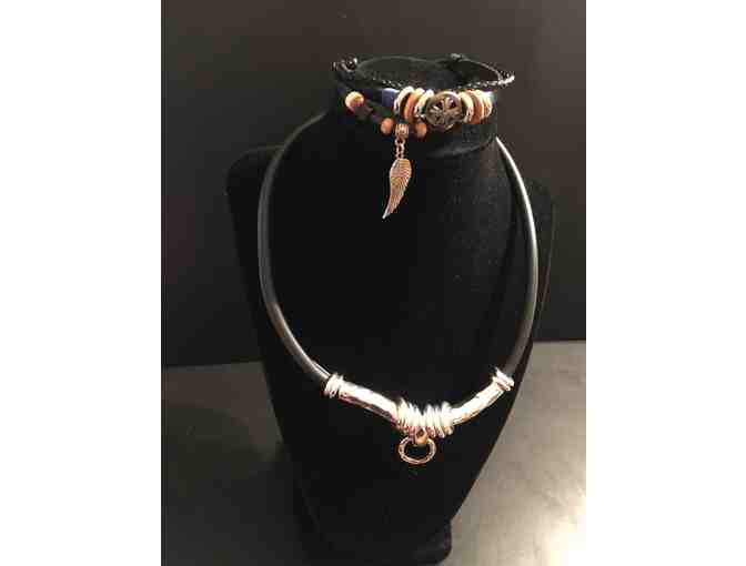 Silver Tone Charm with Wax Cord Necklace & Leather Cord Bracelet with Wing Charm