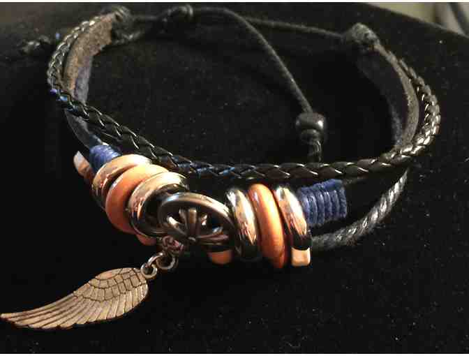 - Bracelet has three Black Leather Cords (one twisted, second braided, third flat) with brown, beige, & Silver Toned beads with a Silver Toned Wing Charm