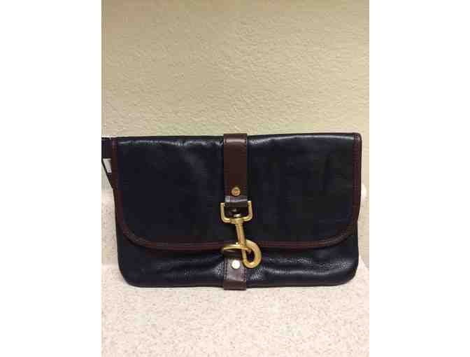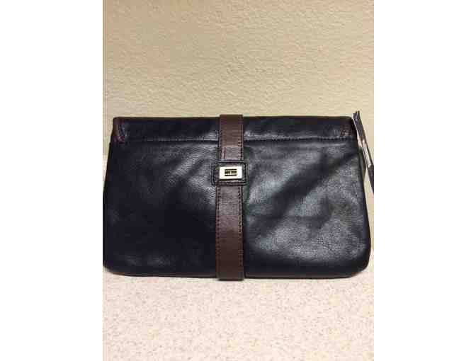 This stylish and versatile Tommy Hilfiger Leather Clutch Purse is in black leather with brown leather piping and a metal clasp.