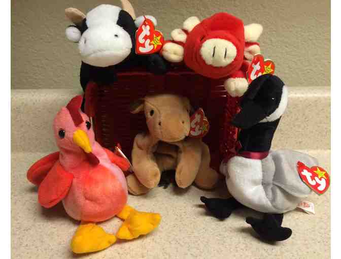 Five (5) Barnyard themed Vintage Collectible TY Beanie Babies (new and used). In aged order: