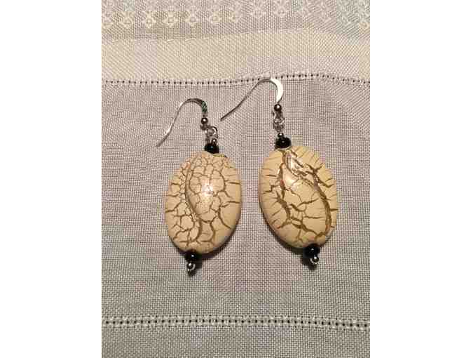 These cute cream colored Crackle Painted Earrings with Black & Silver Accent Beads will add a special touch to your wardrobe!