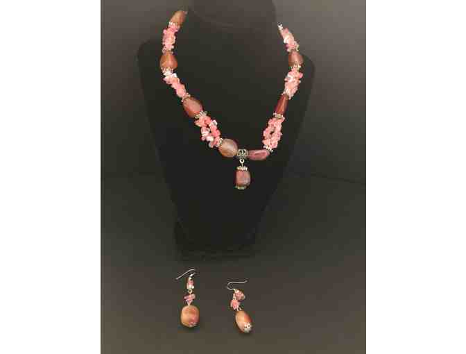 Stone Beaded Necklace & Earring Set - Brown, Light & Dark Pink & White
