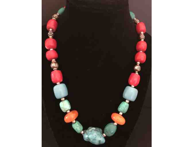 Necklace: Chunky Stone, Large Beads & Silver Beads, Turquoise, Orange, & Red in color - 20"