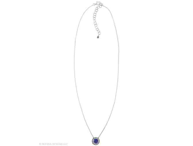 The necklace features a matching pendant created from a purple-blue Cubic Zirconia stone set in oxidized .925 Sterling Silver surrounded by twelve (12) tiny clear Cubic Zirconia stones. The delicate chain is Sterling Silver and has an adjustable length of 16"-18".