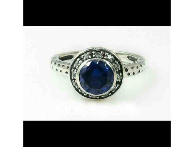 The ring is handcrafted from textured sterling silver with a brilliant blue Cubic Zirconia dome. The stone is lightly and smoothly faceted, encased in a shiny silver band, and adorned in an additional band of flush Cubic Zirconia stones with a final rim encircling the finale in polished sterling silver.