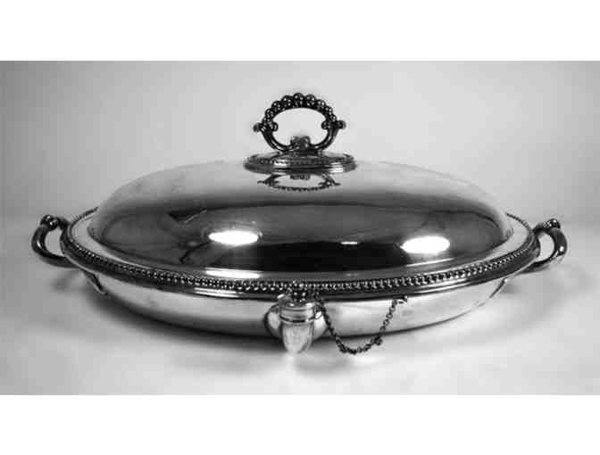 Antique silver covered entree service dish with unique hot-water well by Walker & Hall Sheffield. Dish is in fair condition. 12" x 9". c. 1930-1950.