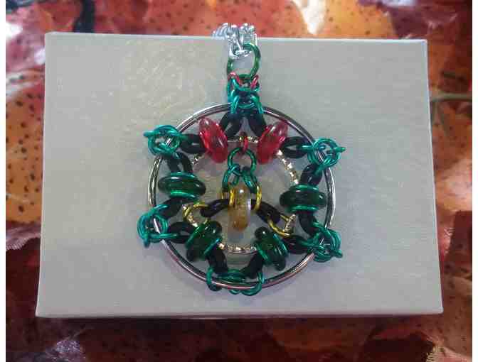 This handcrafted colorful dreamcatcher necklace is not something to pass up, especially as the perfect gift or stocking stuffer. Keep the nightmares at bay all day with this one-of-a-kind beautiful chainmail necklace! Bid before it's too late!