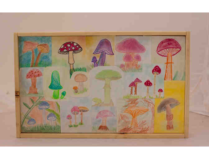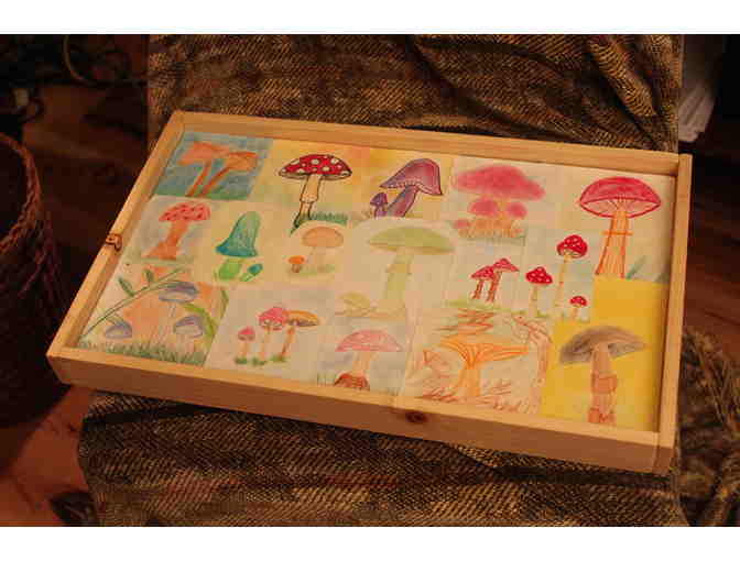 This lovely serving tray was inspired from their 5th grade botany block. This tray is hand-sanded by the children. Their beautiful artwork consists of different types of fungi and is sealed onto the tray, which is made from pine.