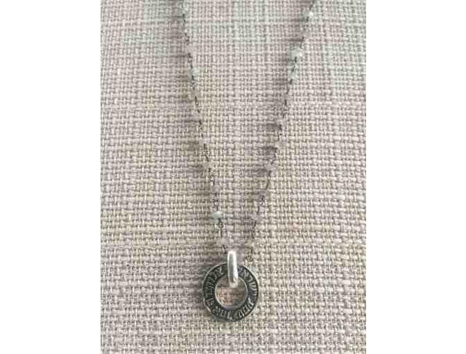 “Shema Israel” amulet in sterling silver on oxidized sterling silver labradorite gem chain.