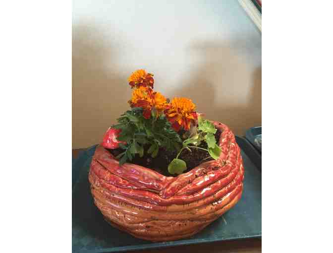Glazed ceramic pots made by the children, filled with organic potting soil and seedlings from the school garden. Each pot comes with ceramic fairy garden decorations. Sizes vary from 8" to 12".