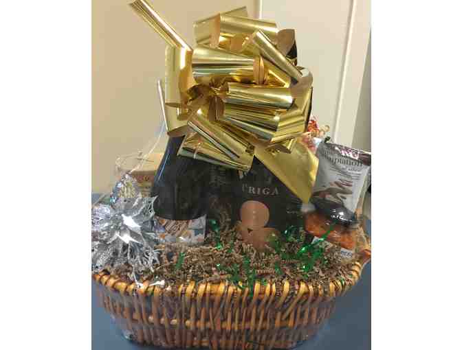 Hi-Times Gift basket including two bottle of red blend wine and fun wine snack items.