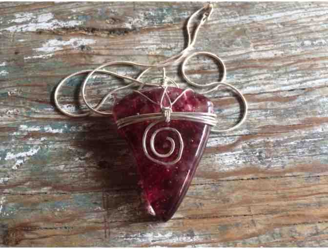 This gorgeous sterling silver wire wrapped, purple glass pendant will compliment any outfit, anytime. Handcrafted, hanging on a 20" silver snake chain, this piece is sure to be a favorite in your jewelry collection!