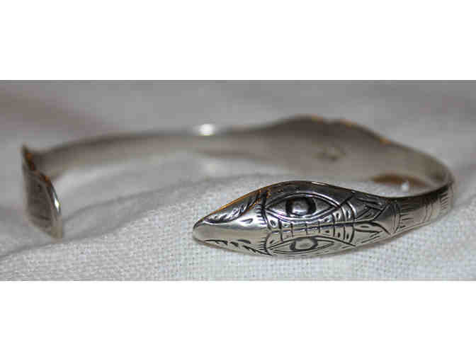 Sterling Native American motif cuff bracelet with an eagle/snake.