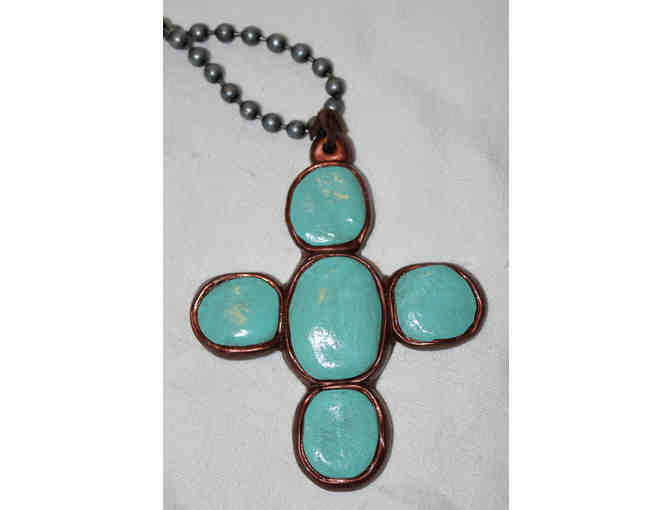 'Sookie Sookie' oversized handcrafted in Texas cross in turquoise color with copper color edges. Hanging from an oversized 26" ball bead chain in an antiqued finish.