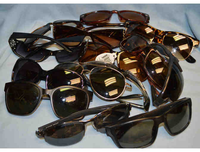 A bag of approximately 15 pairs of men and women's sunglasses in various styles, shapes and sizes.
