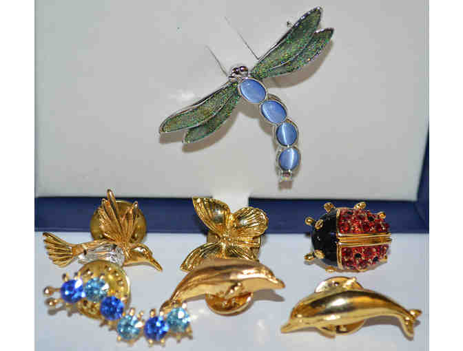 Dragonfly, caterpillar, ladybud, 2 dolphins, hummingbird and a butterfly. Several have crystal embellishments.