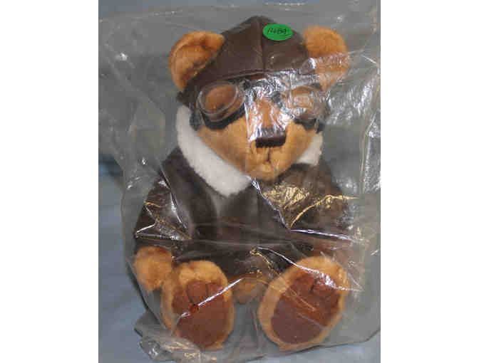 Alaska Airlines 9" Plush Pilot Teddy Bear wearing a leather-like bomber jacket, helmet and goggles. 'Alaska Airlines' on back of the jacket.