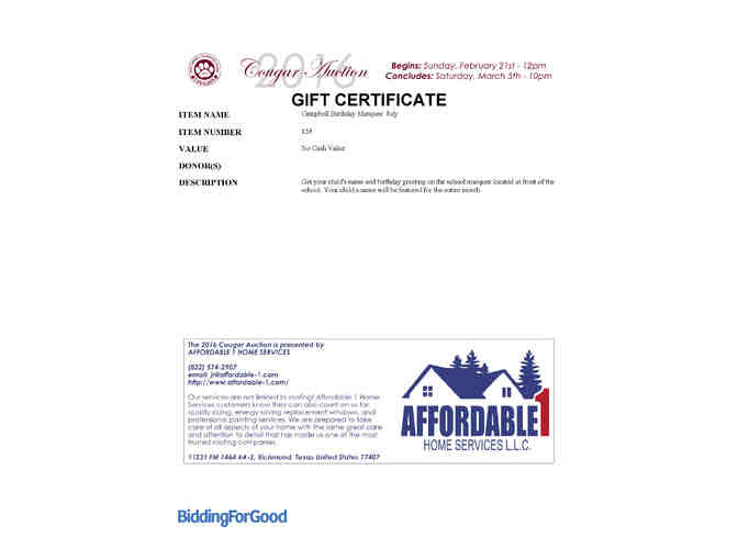 Get your child's name and birthday greeting on the school marquee located in front of the school. Your child's name will be featured for the entire month.