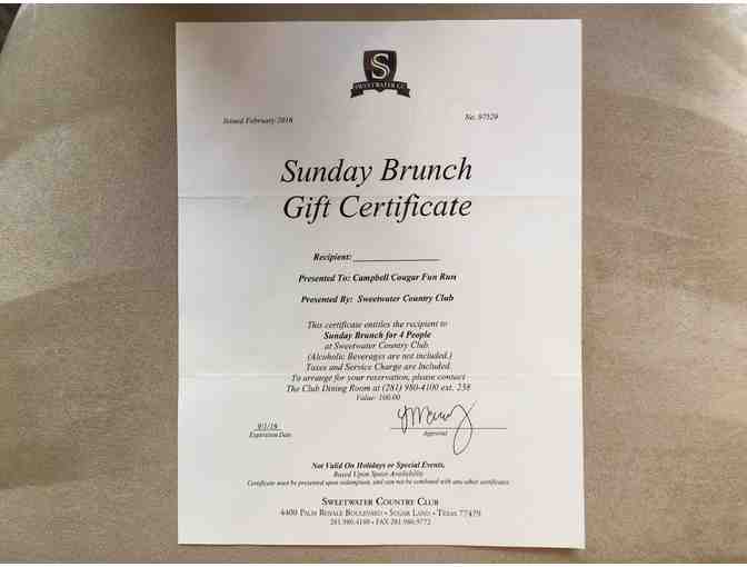 The recipient of the gift certificate is entitled the brunch for four at Sweetwater Country Club. alcoholic beverages are not included. Taxes and Service charge are included. Not valued on holidays or special events. Based upon space availability.