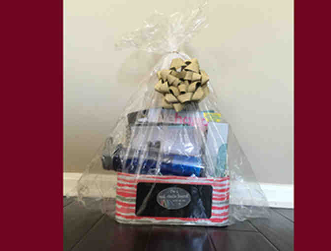 The basket also contains a water bottle, a journal and a few sample magazines. The basket features a chalkboard.