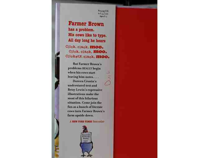 Inscribed "To Zoe - Moo!" by Author Doreen Cronin, this book also contains 5 additional character signatures. As pictured, Farmer Brown, Cow #1, Cow #2, Hen and Duck have all signed.