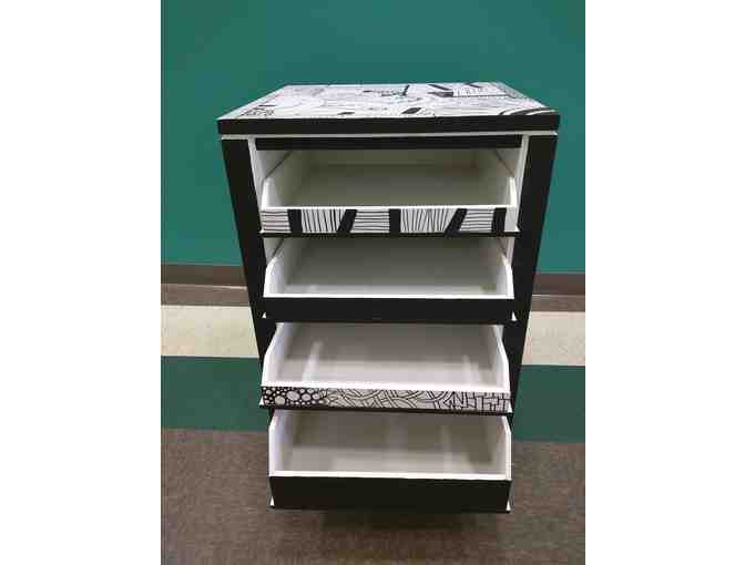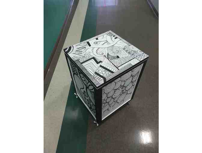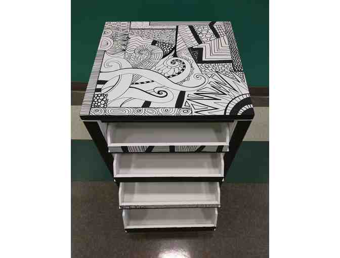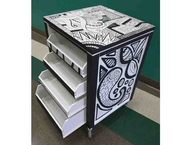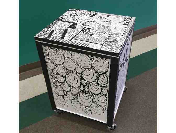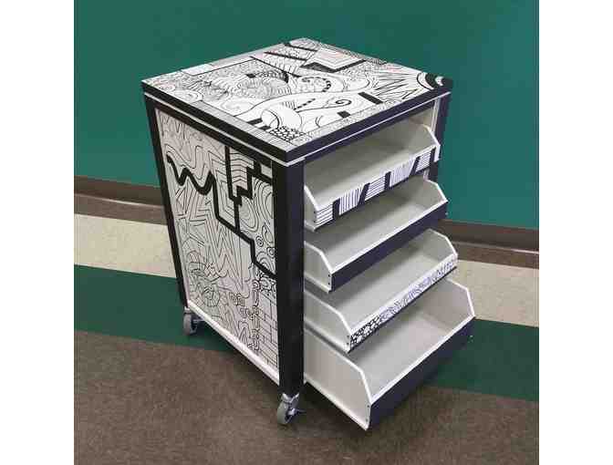 The cart can be left in its black and white state as an elegant statement of intricate patterns. Alternatively, your Bobcat can treat Ms. Morley's design as a starting point for their own art project; filling in the patterns with Sharpies to "complete" the project.