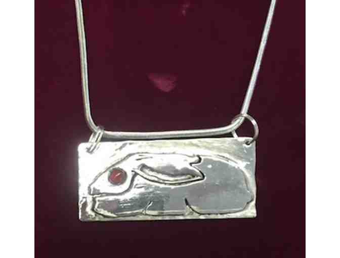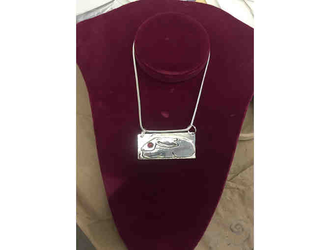 This beautiful pendant was handcrafted by our very own art teacher, Rick Sigler. It has a SAES bunny etched into silver with a stone inlay.