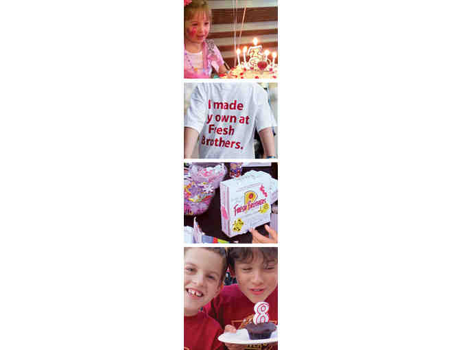 It's a party like no other. And very fresh. First, the kids get a Fresh Brother's pizza box, plus stickers, markers, and crayons to decorate it with. Next, they make their own kid-size pizza. Anyway they want to (so long as it's edible). Off the pizzas go into the oven, and when they're ready, we bring them out in the boxes the kids decorated. Everybody gets dough to play with, plus a one-of-a-kind "I Made My Own at Fresh Brothers" t-shirt, too. Fun? They'll eat it up.