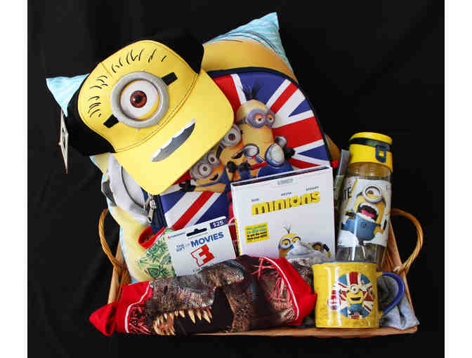 A gift basket from Universal Studios Consumer Products filled with Minions & Jurassic World swag, plus a $25 Fandango Gift Card. Minions swag includes a Minions pillow, backpack, DVD, hat, mug and water bottle. Jurassic World swag includes 2 T-shirts, a tote bag and a Jurassic World phone case.