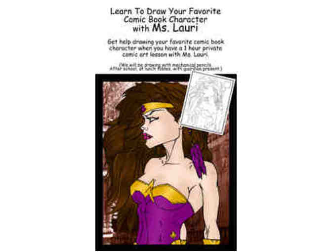 Get help drawing your favorite comic book character with a one-hour private comic art lesson with Ms. Lauri. You'll be doing pencil work as you learn how to draw your favorite comic character. You'll learn to gesture sketch, how to layer on muscle mass, and put the finishing touches on your art.