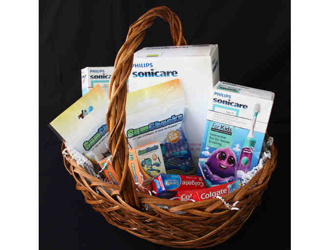Dental care basket includes 1 adult Sonicare, 2 kids Sonicare and 2 GumChuck starter kits with refill packs.