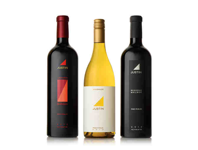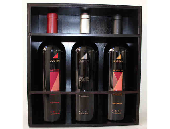 JUSTIN Vineyards & Winery 3 bottle wine collection including JUSTIN Eighty One 2011 (Valued at $150), JUSTIN 2012 Isosceles (Value $72) and JUSTIN 2013 Justification (Value $50).