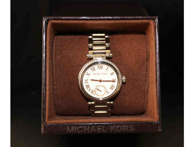 Lady's Michael Kors stainless steel/rose goldtone round dial watch from the Skylar Collection