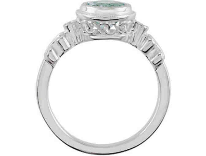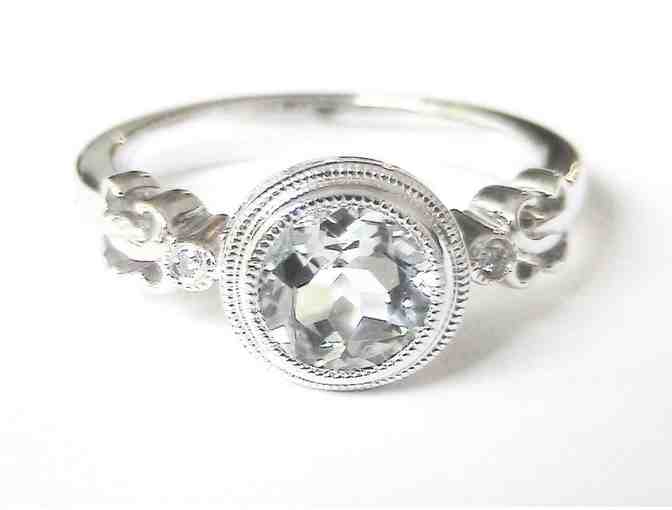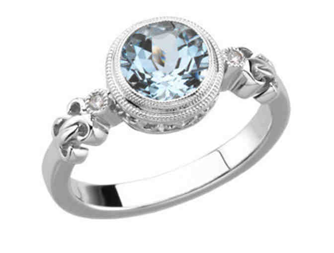 Fabulous diamond and aquamarine ring in sterling silver! This lovely ring has a genuine bezel set 7mm round aquamarine (over 1 ct) flanked by two diamonds and surrounded by vintage style milgrain detail and swirls of sterling silver. Absolutely beautiful and elegant! Size 7.