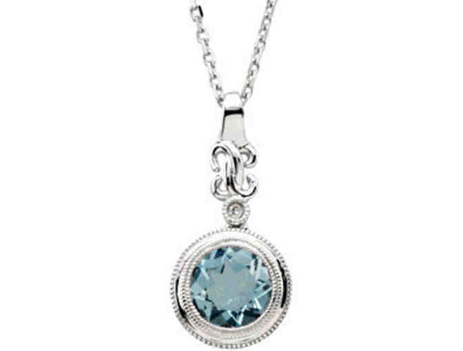 Beautiful diamond and aquamarine necklace in sterling silver! This elegant necklace has a genuine bezel set 7mm round aquamarine (over 1 ct) surrounded by vintage style milgrain detail and swirls of sterling silver. Lovely piece for any occasion.